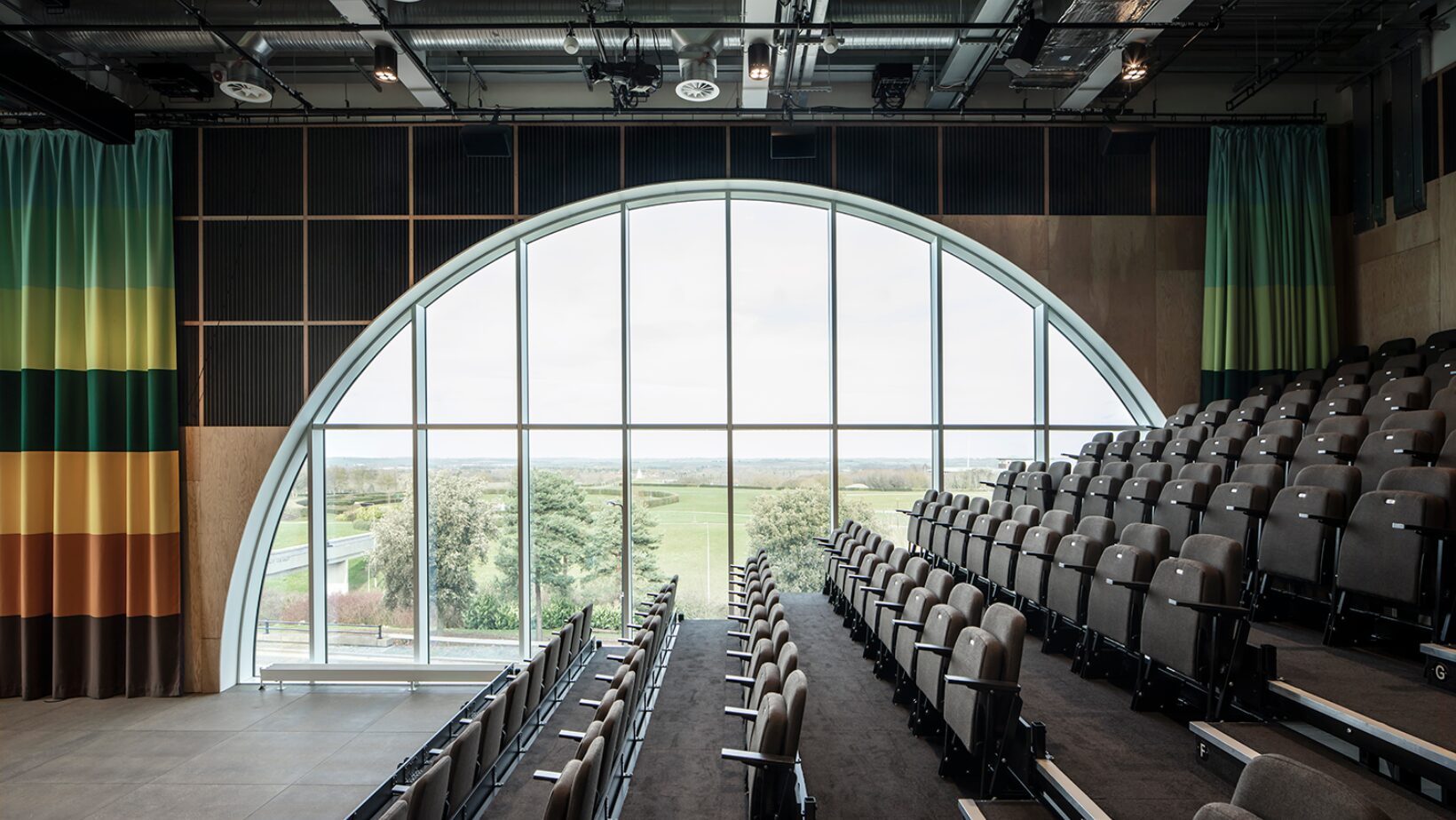 The Sky Room at the MK Gallery is used for exhibitions, lectures, performances, and cinema. MK Gallery is able to enable this wide range of uses by incorporating technical systems that allow them to transform from a stage format with a raised seating bank to a flat floor mode via the use of a telescopic seating unit. Additionally, the room is able to take advantage of the natural light the windows offer or alternately block daylight via the use of a perimeter tracked curtain system that provides both light block and sound absorption. As a cinema, programmed by Curzon, the Sky Room has a dedicated projection room, excellent sightlines, and cinema-quality surround sound. Lectures and performance functions are supported by an overhead pipe grid to support audio and stage lighting infrastructure. The pipe grid is sized and rated for suspension of gallery exhibits and special installations. For MK Gallery this means that in the same square footage they can flexibly program the space for more hours of the day and with the telescopic seating bank transformation from seated risers to flat floor can be achieved in under an hour.