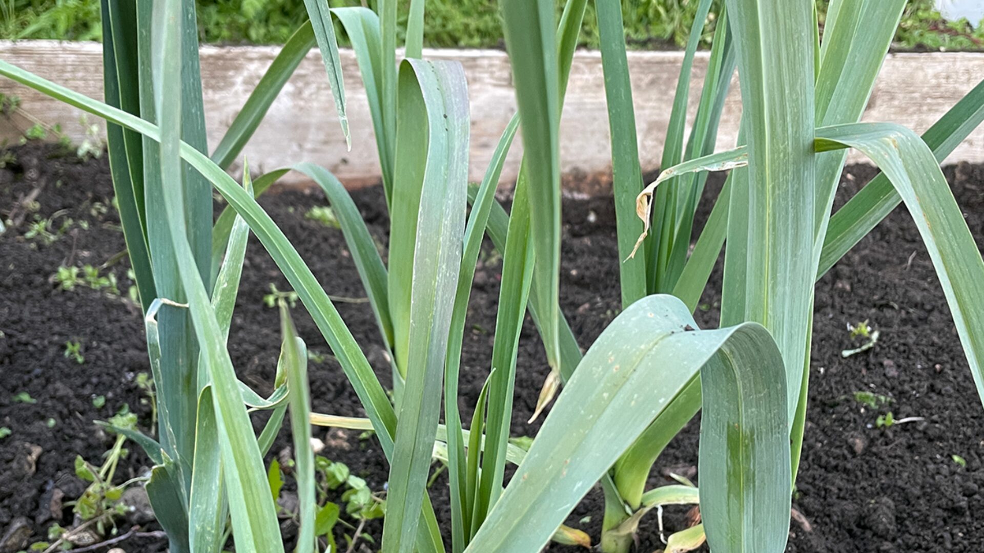 “Our beds are standing by for spring planting. The visible growth in round bags are garlic and onions, planted last October, ready to harvest come July, along with a strawberry patch in the low square bed. The center bed also accommodates a place for composting food scraps which feeds the soil and plants.