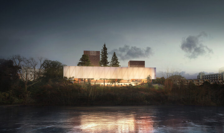 An external render of The Ronald O. Perelman Center for the Performing Arts at the World Trade Center. Render: REX