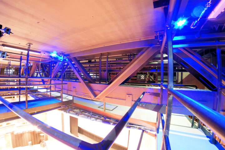An improved, safer technical level has been installed in the auditorium, along with new orchestra elevators and a replacement of the existing screw-jacks with modern elevator mechanics. This allows elevator 1 to be a double stacked structure, providing the client with a full pit and simultaneous four stage extension. Provision was also put in place to allow for a storage corridor beneath elevator 2. The old 60mm counterweight fly bars were replaced with an industry standard 48mm Vierendeel truss.