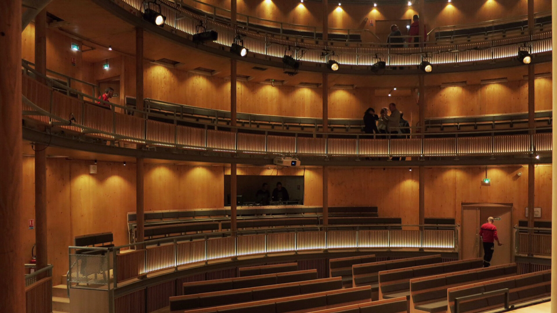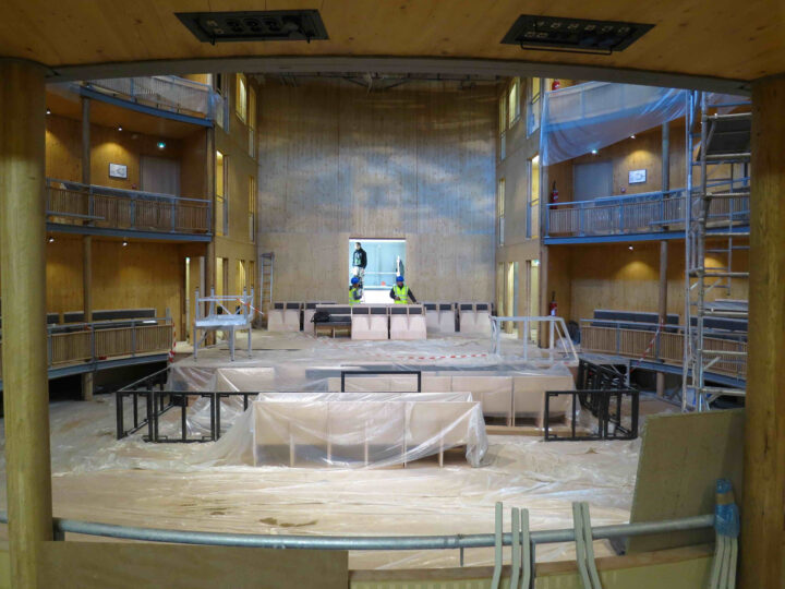 Andrew Todd’s design for an Elizabethan theatre form makes extensive use of structural timber and surrounds the theatre with a cylindrical bamboo screen, which helps the building to dissolve into its surroundings. The building uses very little energy through the use of natural ventilation systems and low-energy lighting. Daylight within the auditorium can be blacked out with blinds – even the substage green room has a skylight to allow daylight to flood backstage.