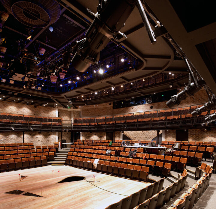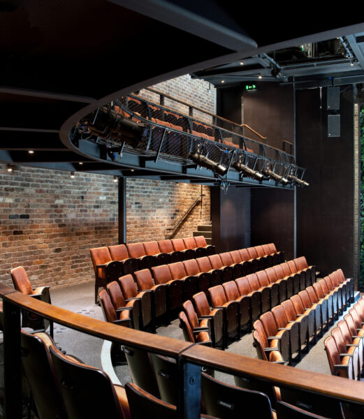 Following extensive studies, the design team took the brave choice to demolish the existing building and create a new modern facility that aimed to capture the spirit of the previous incarnations. The new auditorium re-creates the wide thrust stage of the old theatre, but with an additional audience gallery and over-stage technical bridges designed to allow for vastly increased seating, staging and rigging flexibility. The primary stage format wasn’t the only connection to the previous building; a similar golden fabric was chosen for the new seating, and bricks salvaged from the demolition were used to create the new auditorium walls.