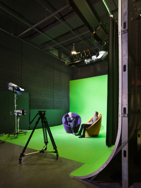 The new Film & Media Center at the college saw the conversion of an existing retail building into a dedicated home for Pratt’s Film & Media department. The building now houses three full-size sound stages for film and video work. One space can be linked or separated with an acoustic shutter to create a single double-size volume for large sets. An acoustically-isolated recording room with 5.1 surround sound audio playback capability was configured for production work as well as classroom tutoring. The centrepiece of the project is a 100-seat screening room which is used as a teaching and lecture space. The screening room includes a retractable seating section which provides additional flat-floor teaching and workshop space. The building also houses classrooms, workshops and administration spaces to support the work of the department.