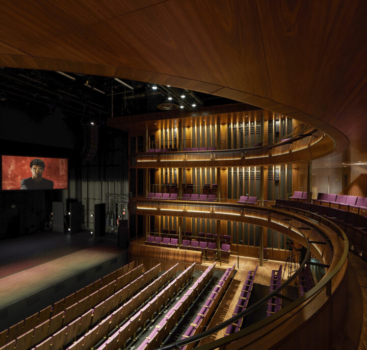 Following the sweeping staircase down into the double-height lower-ground foyer, you’re met with an informal performance space which can be seen from the expansive, glazed Bow Street facade above. Doors across the foyer lead to the reinvented Linbury Theatre, previously a black box studio. Built within an existing concrete shell, the 400-seat capacity has been retained. Multiple, reconfigurable seat forms in rich purple upholstery, designed by Stanton Williams and Charcoalblue and built by Race Furniture, allow for added flexibility within the space.