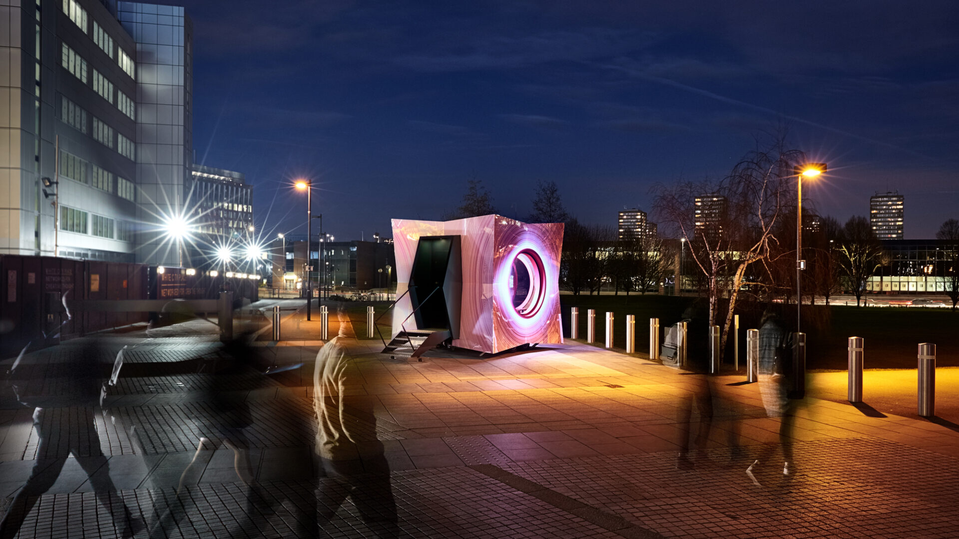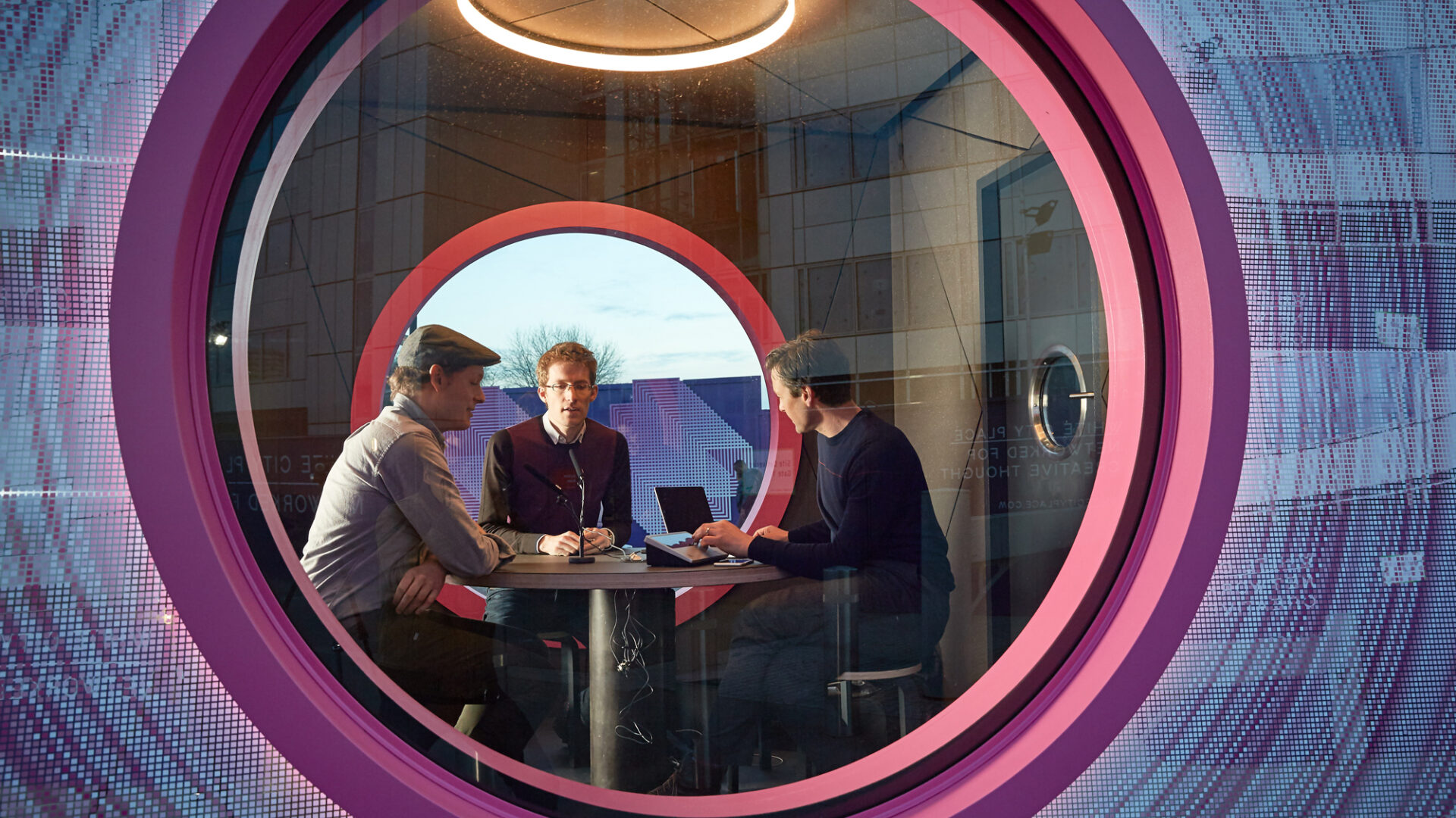 The Pod is a moveable, temporary structure established as a home for podcasters and musicians. At just twelve square metres, the compact space seats up to six people and is equipped with the latest recording and studio technology.