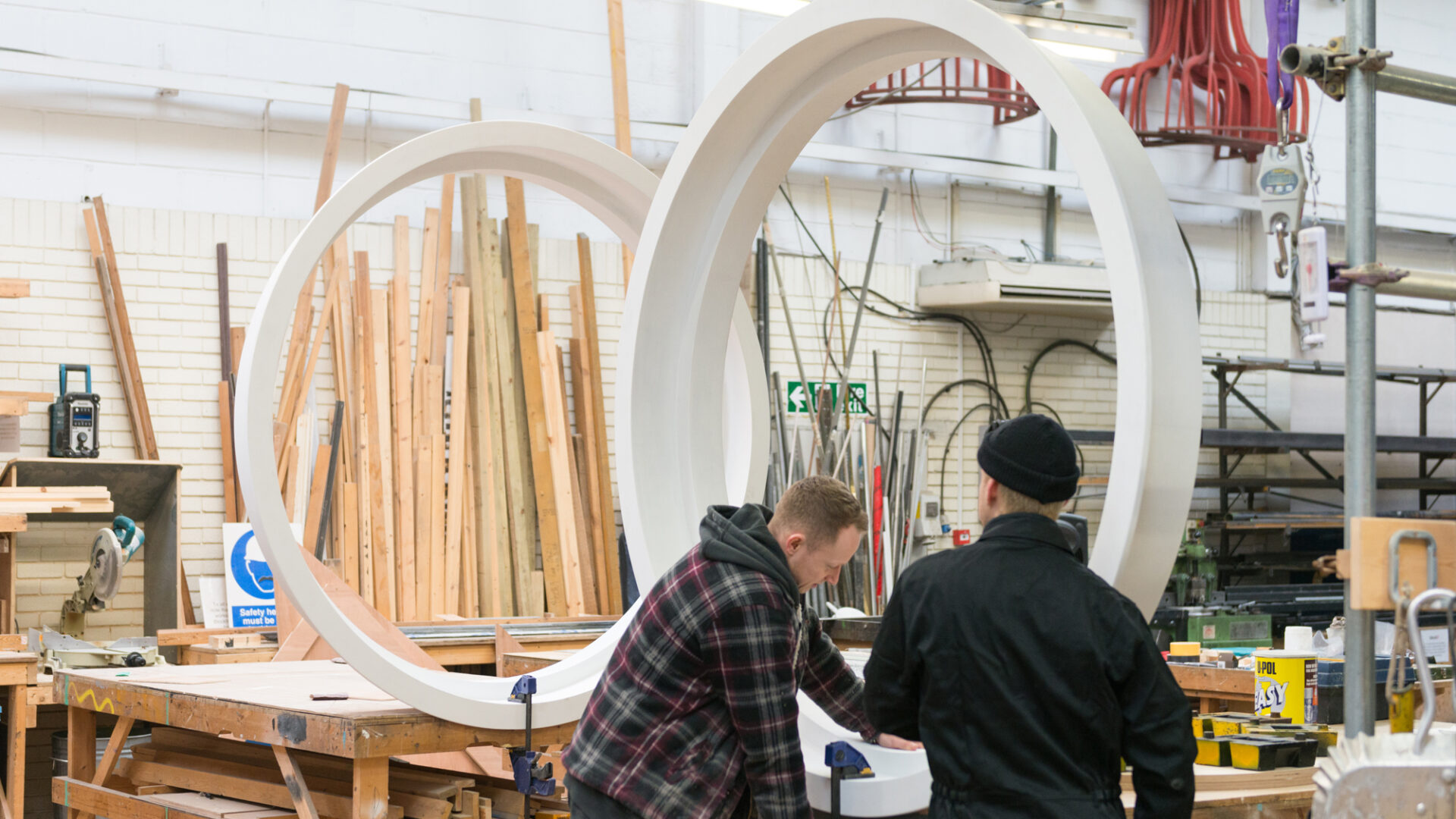 The frame of the structure was created using steel box sections, overlaid with CNC cut and folded mirror finish Dibond aluminium composite.